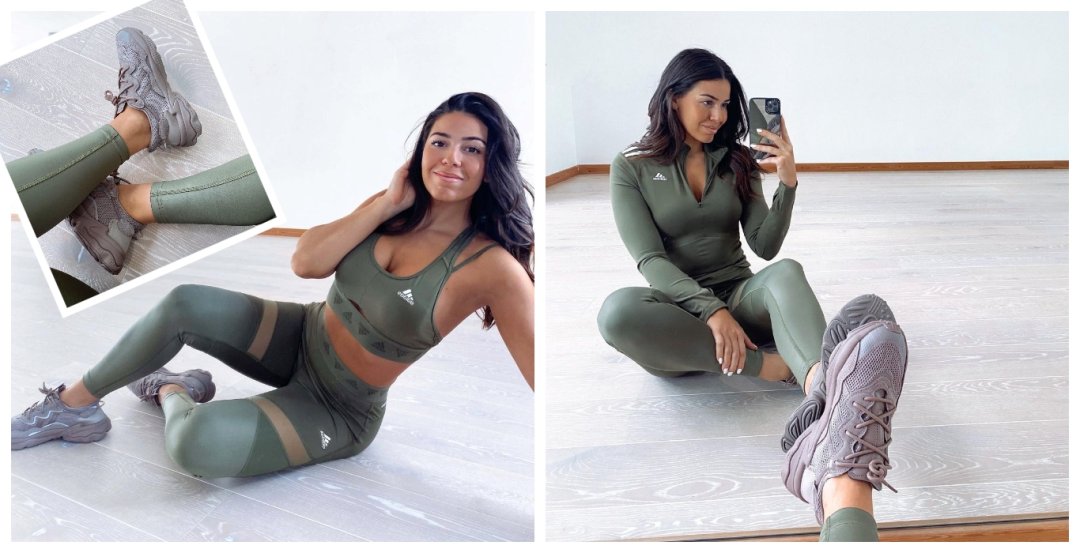 If you’re hittin’ the sesh, make sure you feel your best at the workout in adidas‘ latest fitness essentials. Emily’s sportin’ the Shine Tape Sports Bra and Tights for a workout-ready look, paired with these Ozweego sneakers for a head-to-toe adi moment! What d’ya think?
