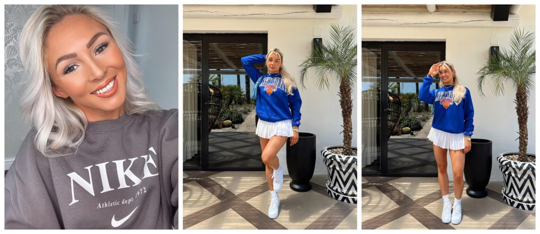 Keepin’ things classic, Abigail’s look is givin’ us all the Summer feels 💛💛. Reppin’ the latest women’s New Era collection, this NY Knicks sweatshirt has got a premium vibe with shiny satin detailing. We’re lovin’ the sweatshirt and tennis skirt combo, and ya can’t get it wrong with a pair of AF1’s!