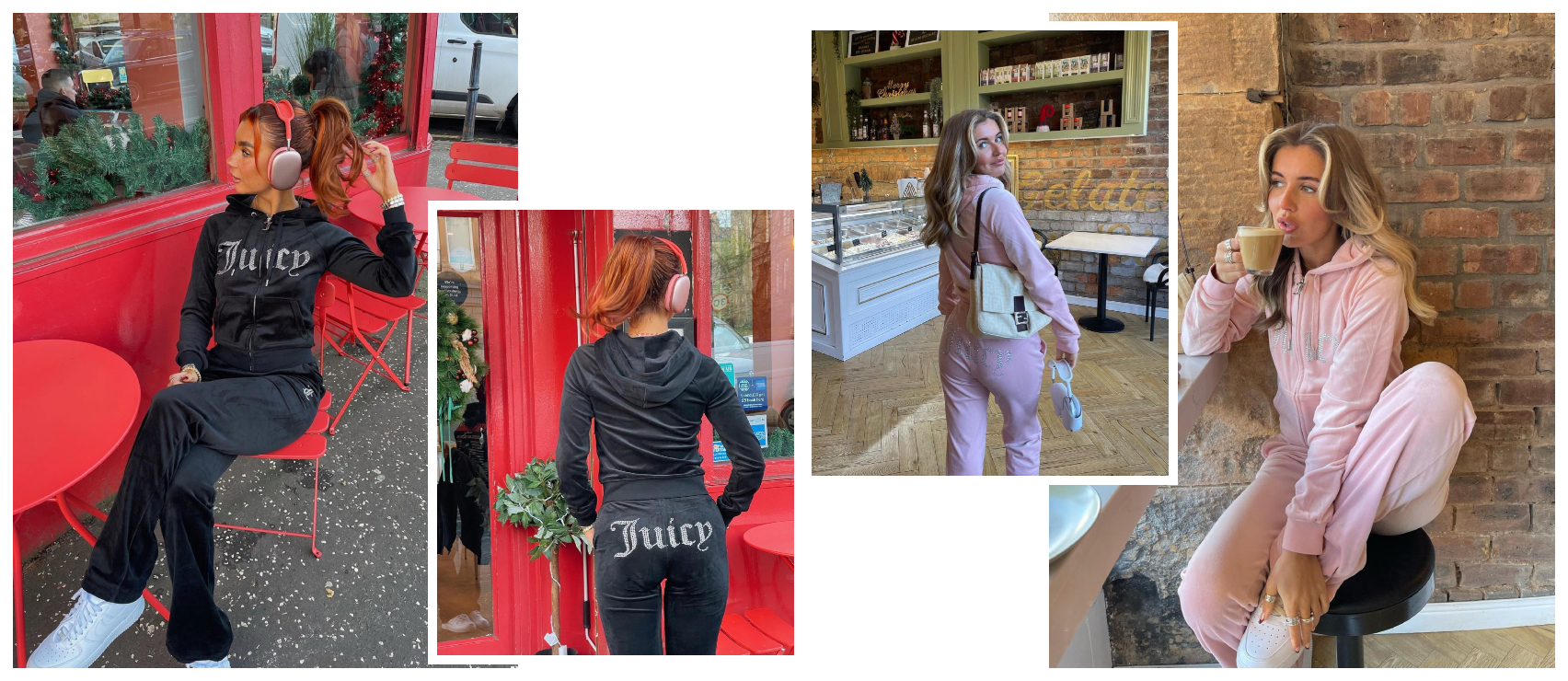 Cosy up for a coffee date like Molly in this Juicy Couture tracksuit set. The baby pink hues are givin’ us allll the retro Y2K feels, and the iconic Juicy Couture diamante logo adds some signature sparkle. ✨