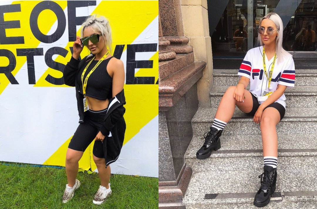 Model-babe Sherrie took the trip up North from London to hit up Parklife. Making waves in Manchester, Sherrie rocked a cropped Nike bralette, cycle shorts and some fresh white sneakers – finished up with a Nike cap to keep the rain off.