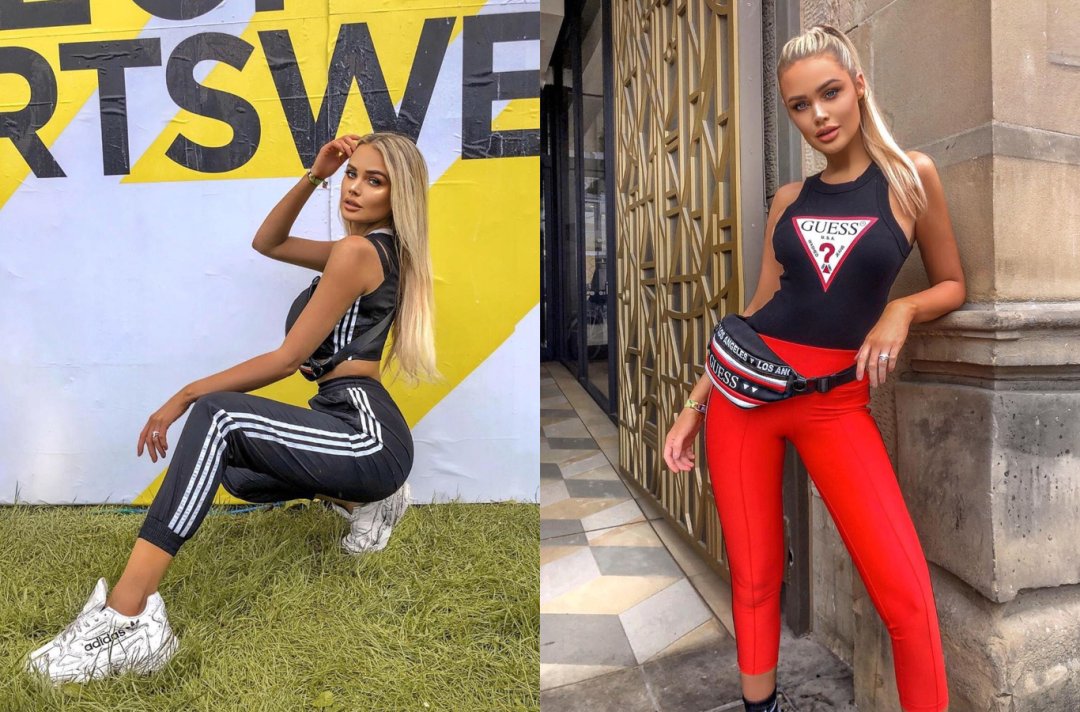 On the Sunday, Rachel added a pop of colour to her look, steppin’ out in GUESS for a luxe vibe. She’s wearing a black and red combo with the GUESS bodysuit and matching waist bag.