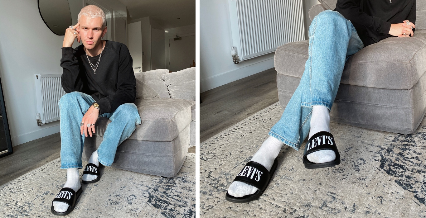 Keeping it classic Levi’s, Joe (@josefmichael_) has paired his slides with denim and a simple black sweatshirt.