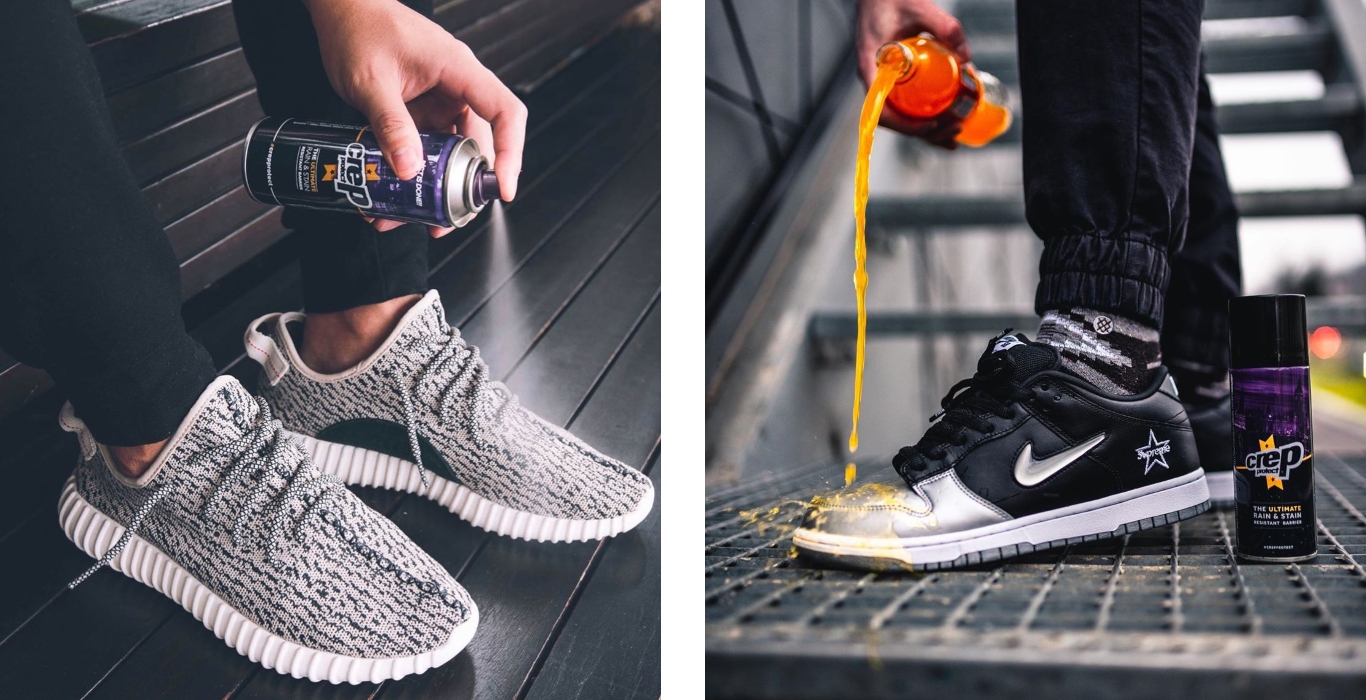 First things first. Prevention. If you don’t want your fave pair of creps to come in harm’s way, invest and prep ‘em with some Crep Rain and Stain Shoe Care Spray. Covering canvas, nubuck and suede this spray creates an invisible coating which repels liquids and prevents stains.