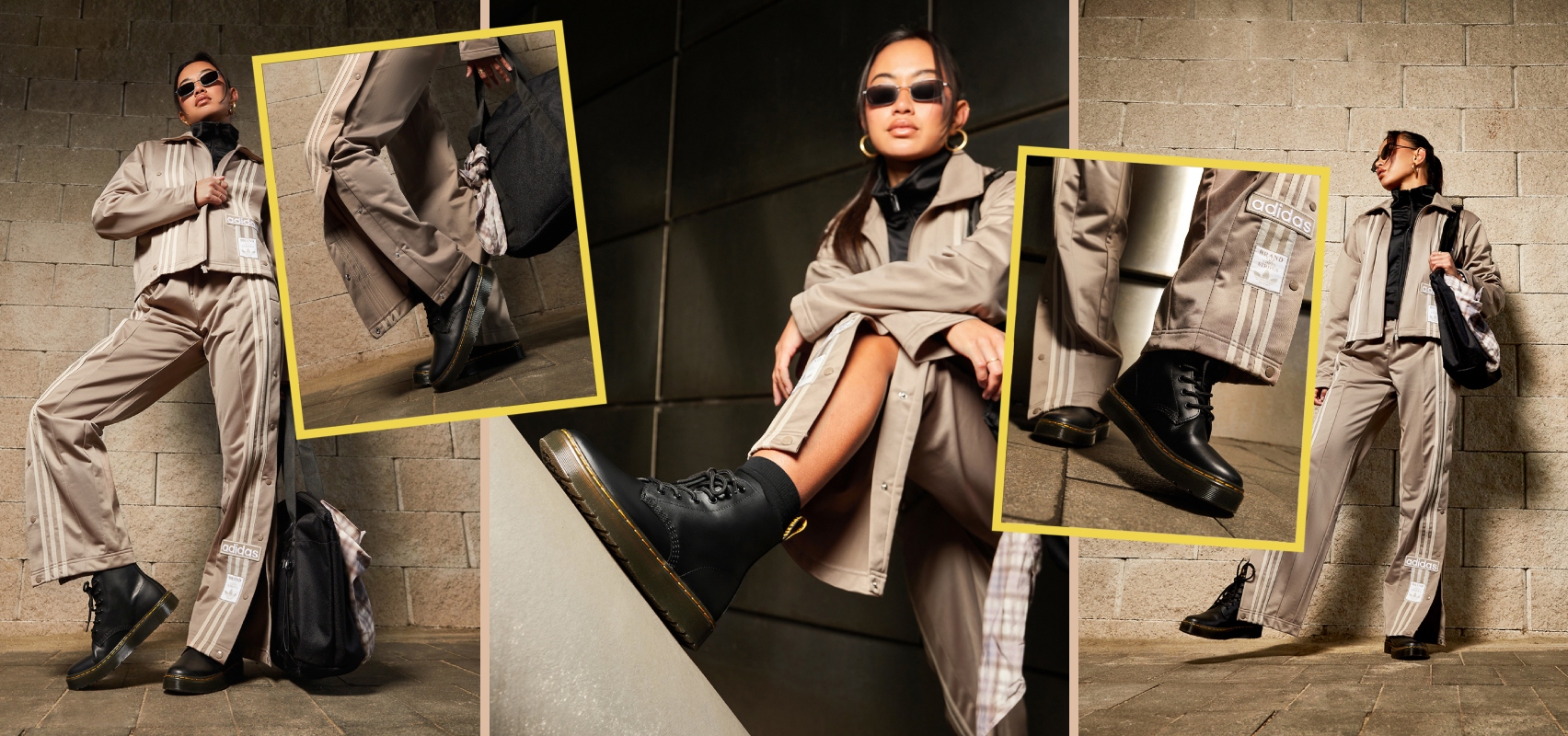 Style with neutral tones to give these boots the main character energy they deserve. A wide-legged tracksuit with press-stood detailing, allows you to open the hem and flaunt your footwear. Pair with black accessories to tie the look together, turning a casual vibe to an Insta-worthy ‘fit.